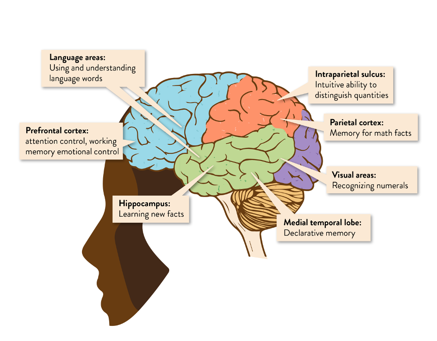 Some of the most important brain regions involved in mathematical thinking are described in Figure 1. Together, these different areas form the functional system of mathematical skills. Many of these regions are not maths-specific and are involved in other abilities. Some regions are more specialized for mathematics than others. Mathematical understanding develops through the interaction of all these areas and abilities; the neural connections between these areas develop in early childhood when neural plasticity is high.